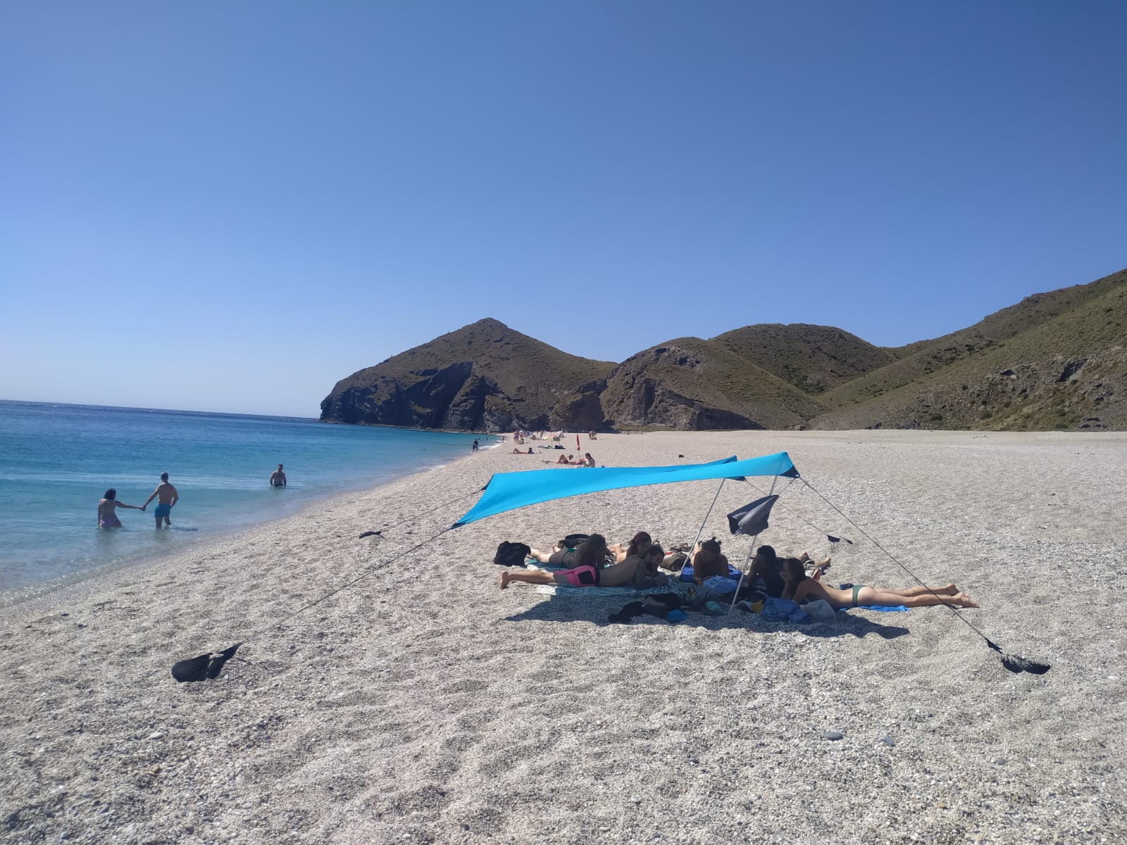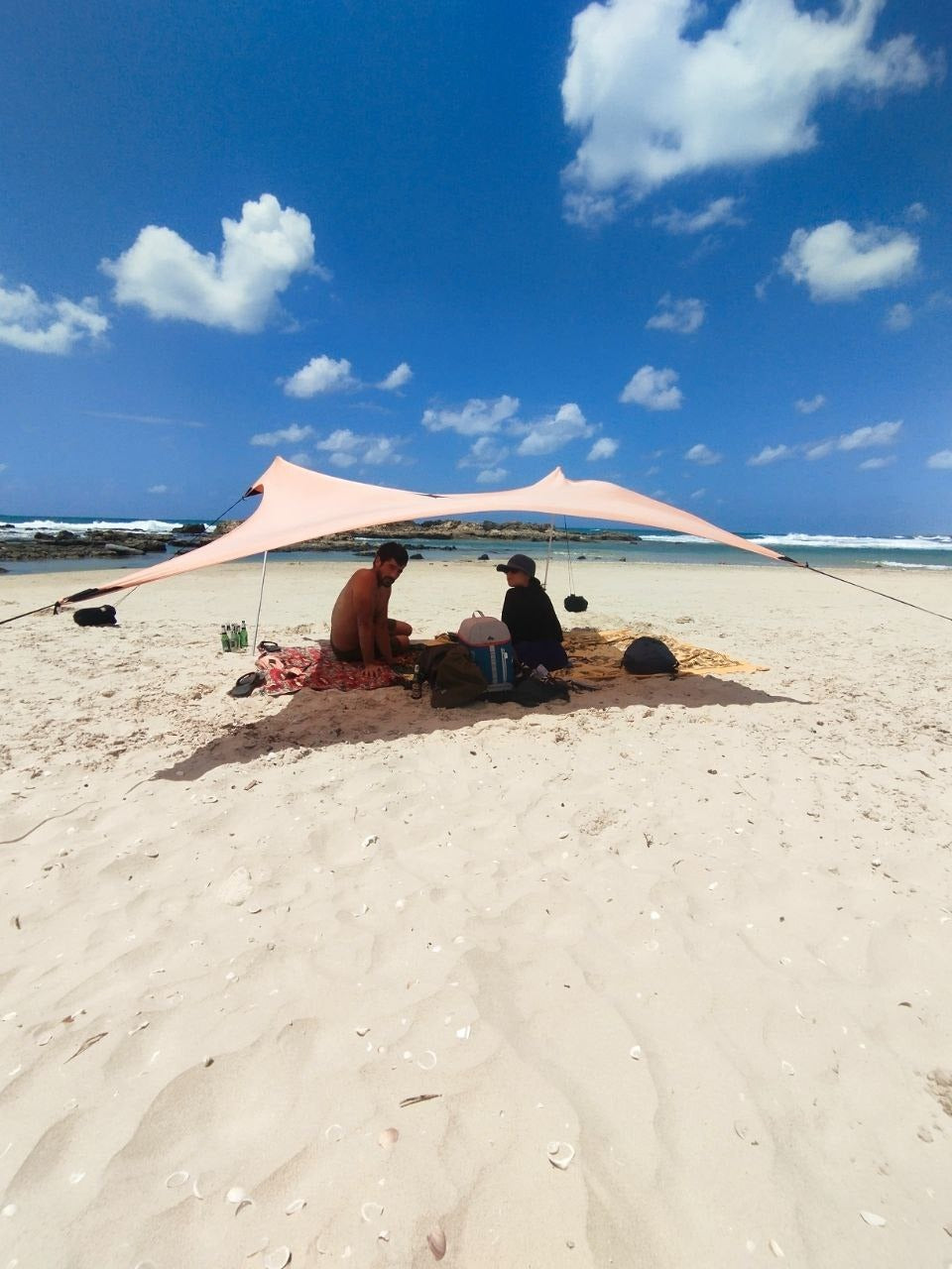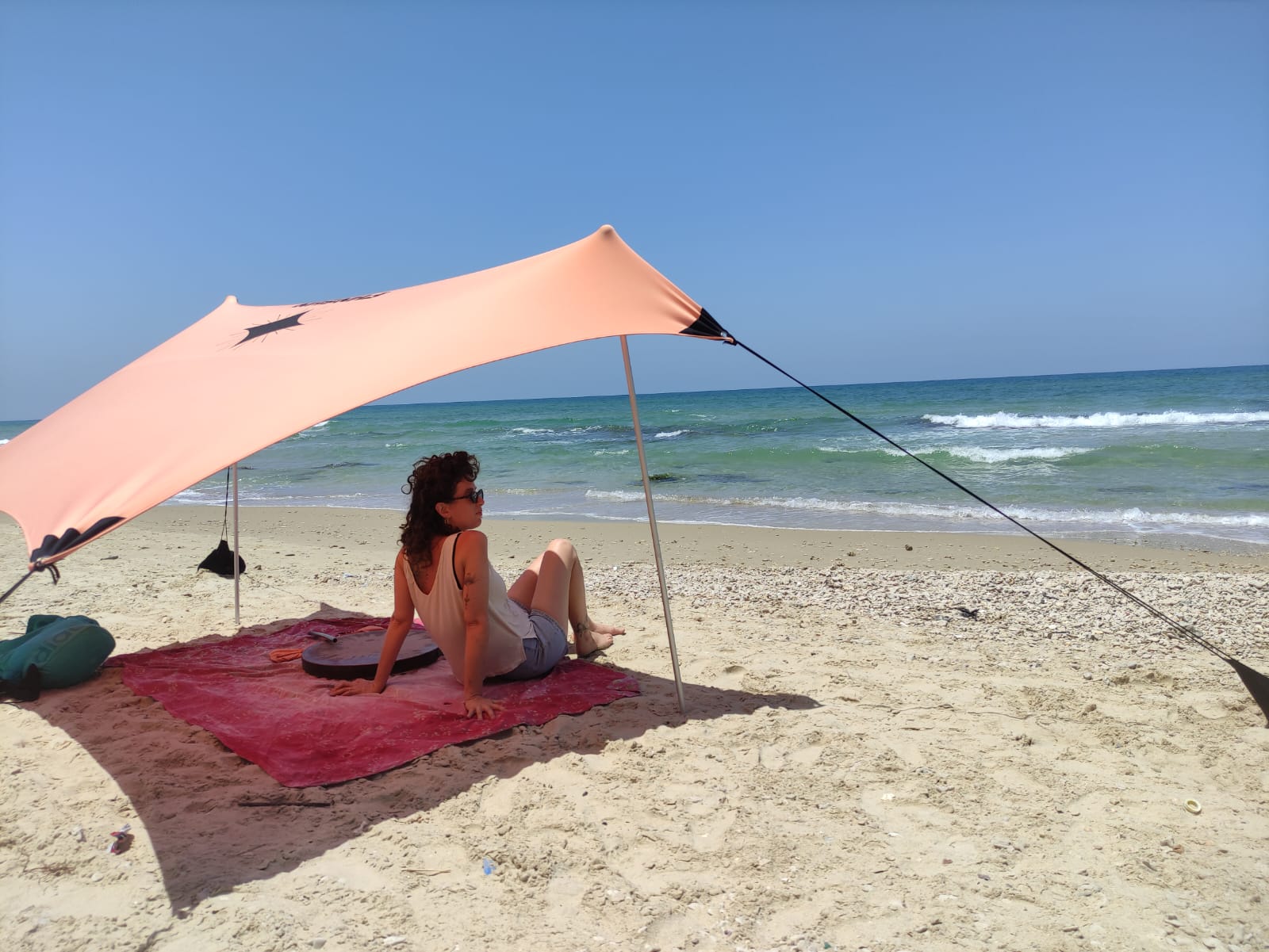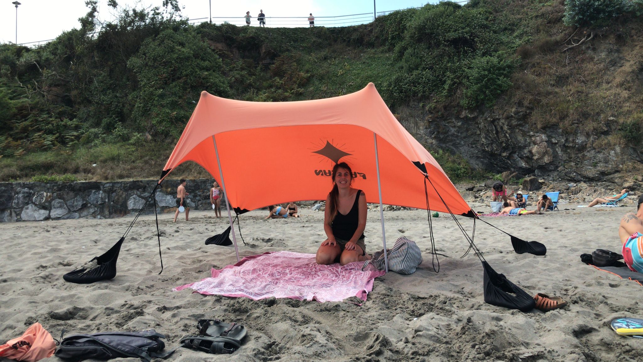 Es simplemente la solución perfecta. Se dobla pequeño, se abre en segundos y la verdad es que se ve muy bonito en la playa. Muy recomendado para quien quiera sombra con poco esfuerzo.